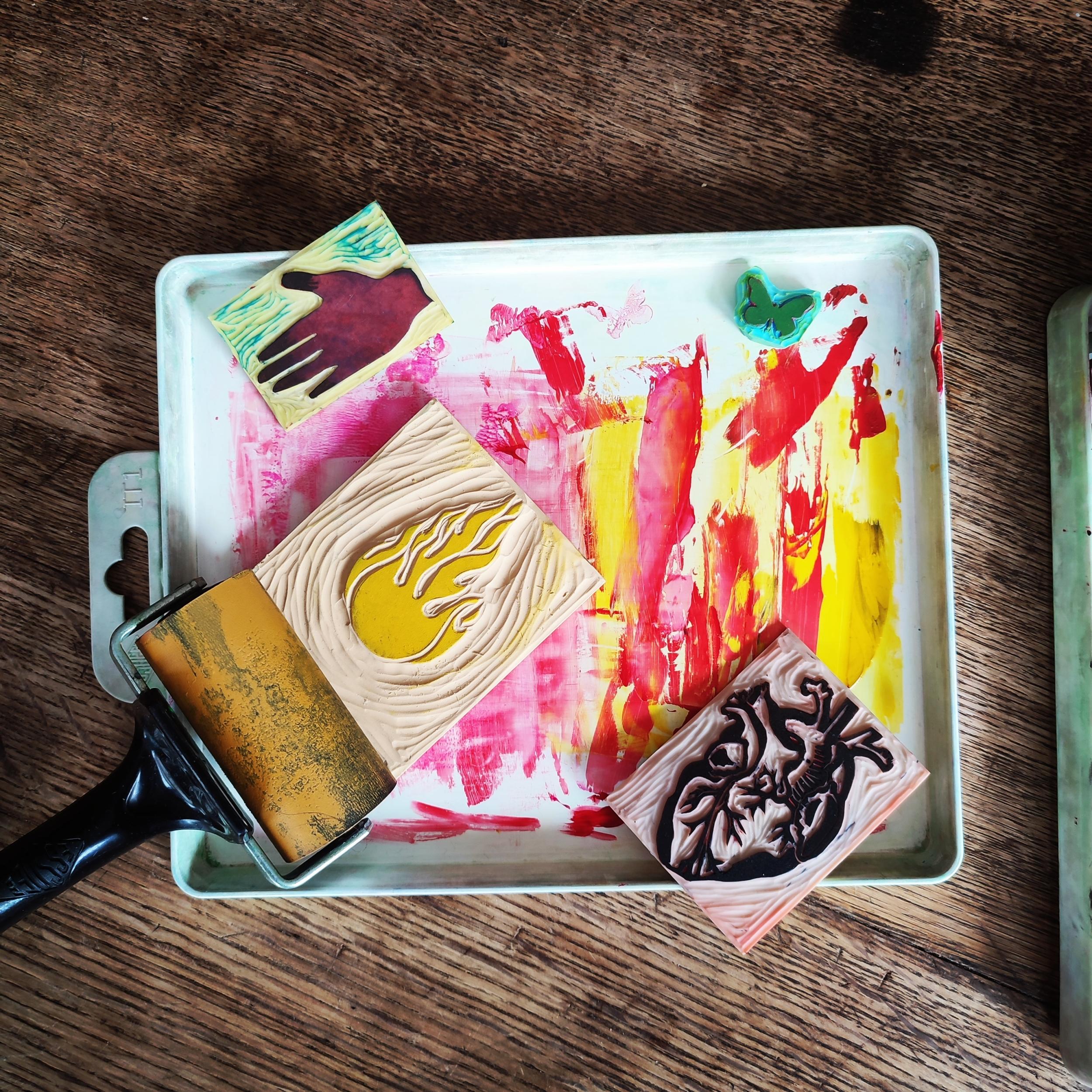 Une fois installés, place à la création ! À l’aide de gommes à graver, d’outils spécifiques (les fameuses gouges), et d’un joli éventail d’encreurs colorés, vous réaliserez deux, quatre, voir six gravures, une de chaque côté de la gomme. Que vous partiez d’un croquis personnel ou que vous vous laissiez inspirer par les modèles disponibles, vous serez accompagné.e par Veronica tout au long du processus pour obtenir un rendu unique.